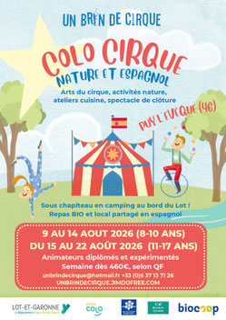 En plus des stages qui ont lieu toute l’année notamment sur Prayssac, Brin de Cirque organise des colos familiales ( 15 enfants ) où on mange bio à midi, où on pratique, se baigne dans le Lot ou dans la piscine du camping les vignes à Puy l’Evèque qui accueille le chapiteau tout au long du mois d’août.
